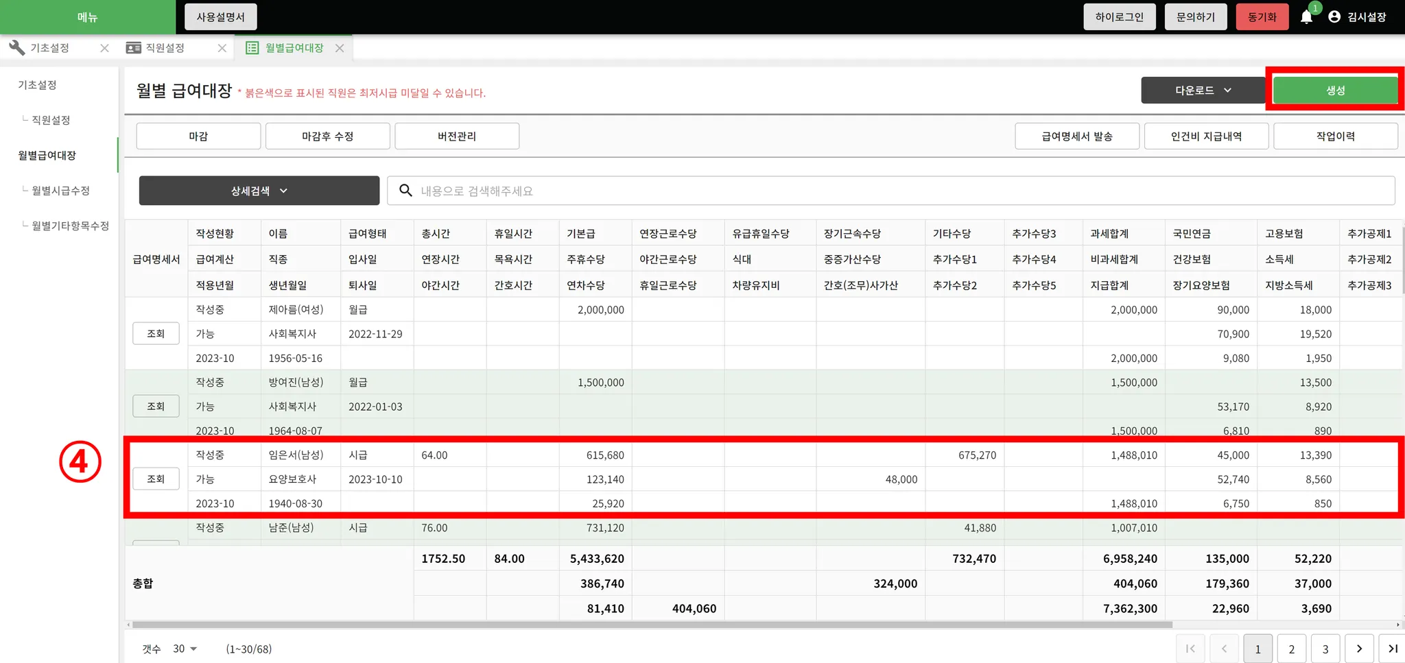 ④ 생성된 급여대장을 확인합니다.
