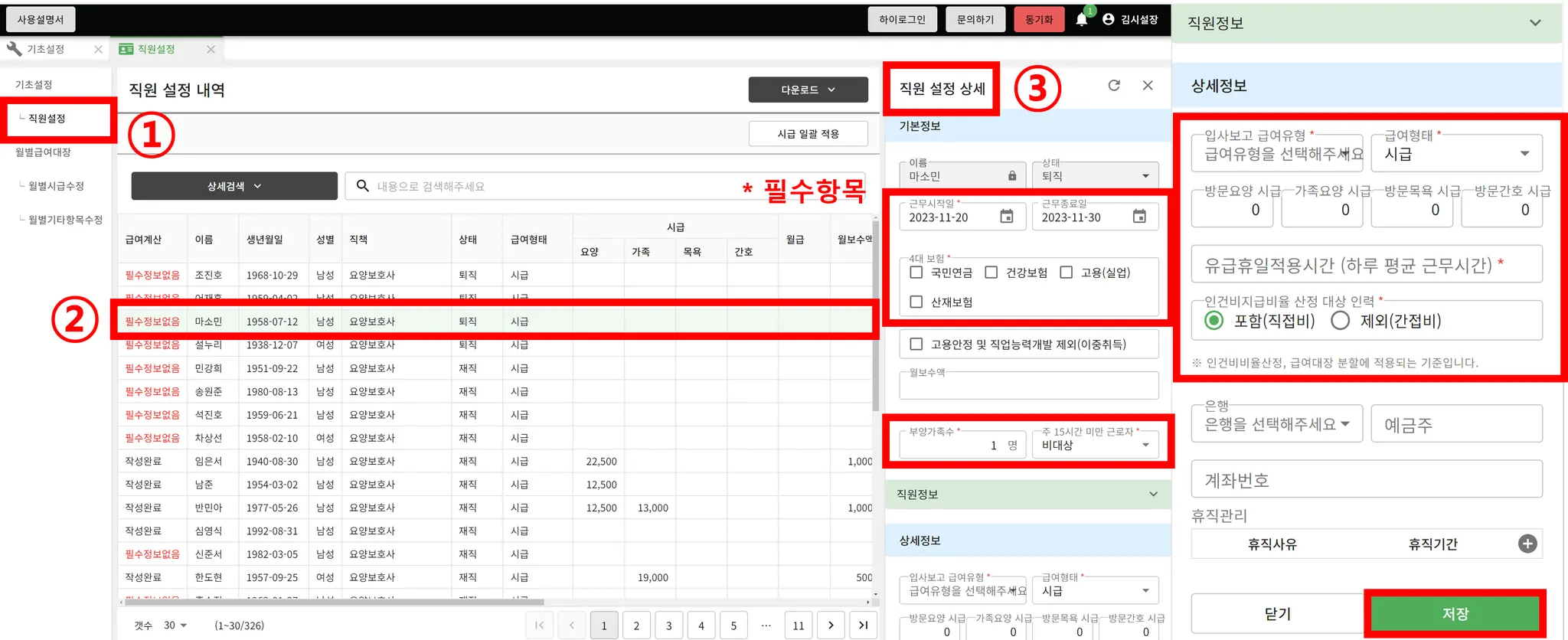 ③ 우측에 생성된 직원설정 상세 화면에서 * 표시가 되어 있는 필수 항목 입력 후 저장합니다.