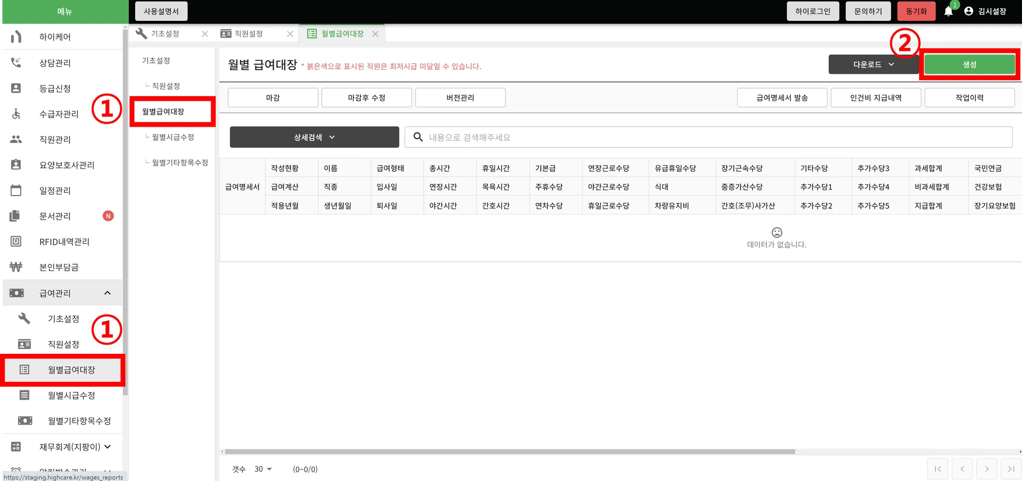 월별급여대장 메뉴로 접속하여 [생성]버튼을 클릭하여 주시면, 공단에 청구 된 모든 종사자의 근무시간이 월별급여대장에 동기화되며 급여대장이 생성됩니다.