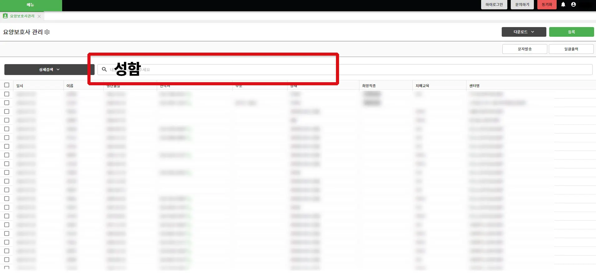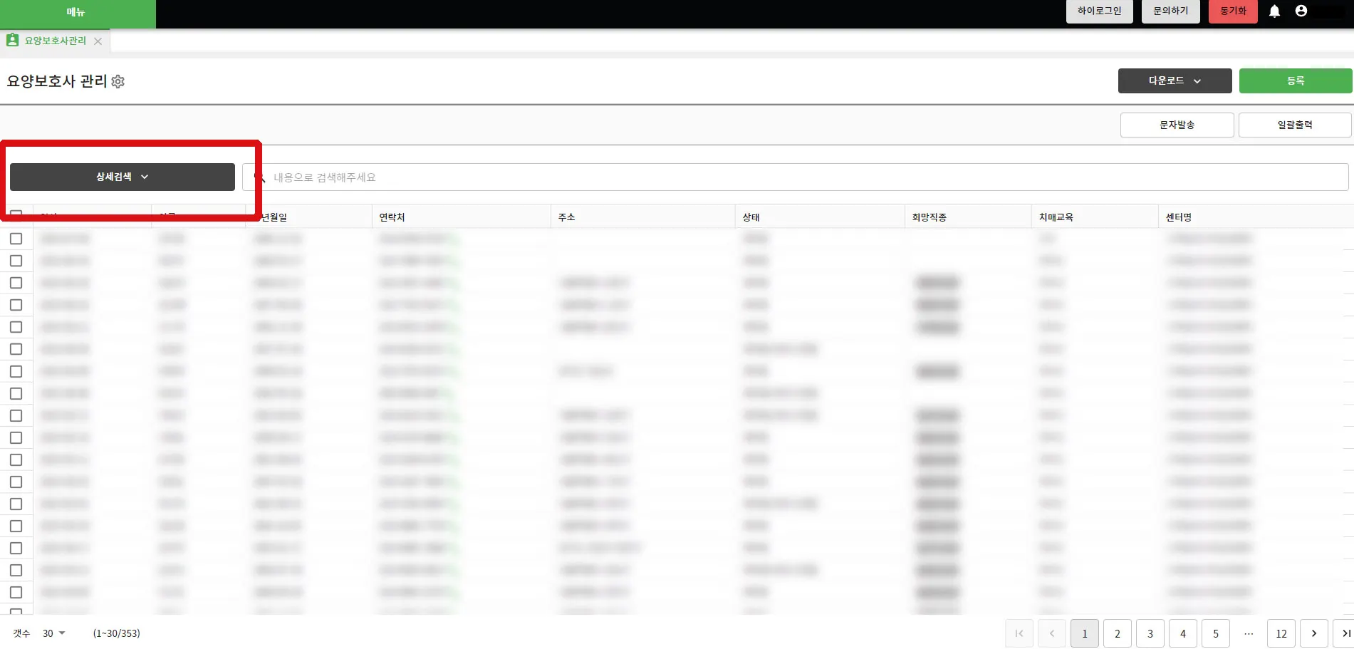 ② 예를 들어 요양보호사관리의 상세 검색을 확인해볼까요? 상세 검색 버튼을 클릭해 봅시다.