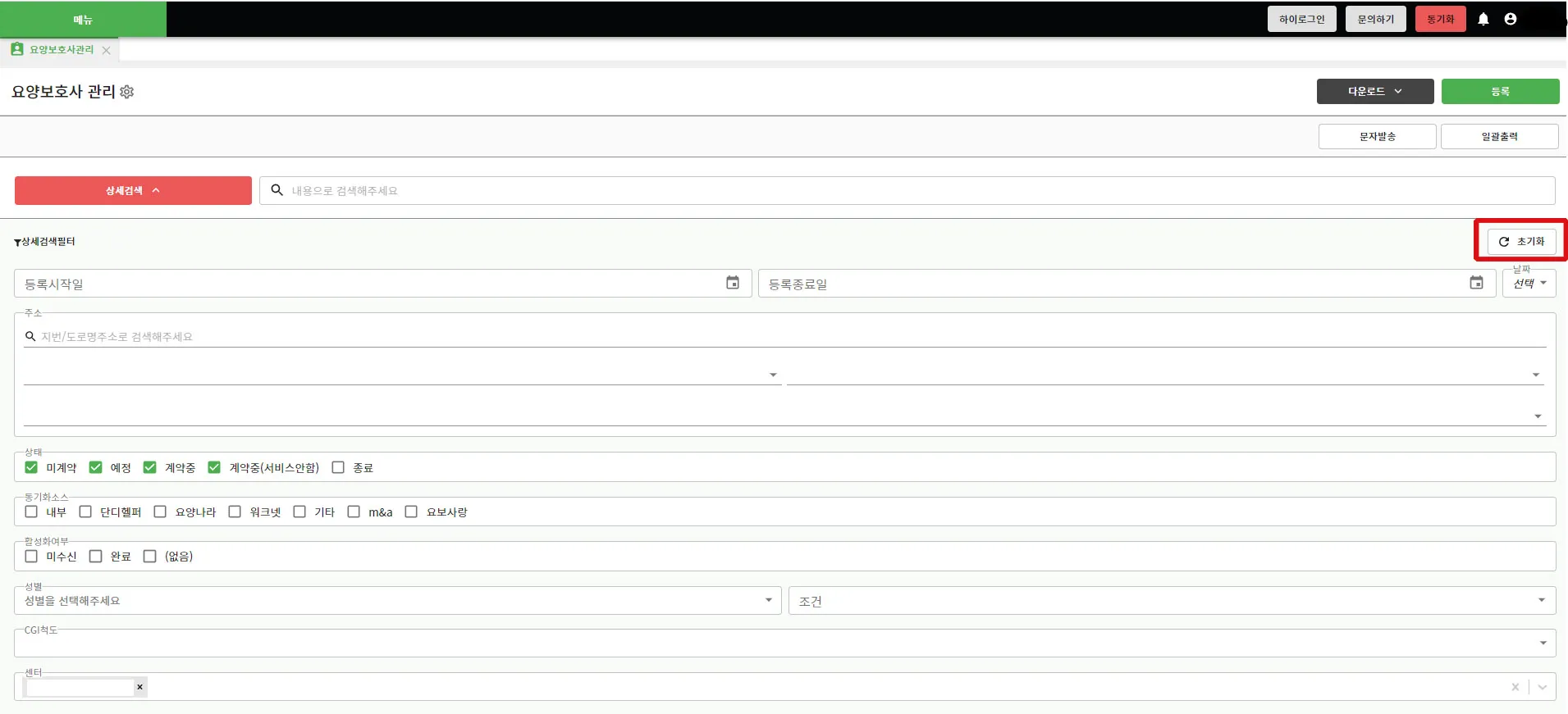 ⑤ 예로 든 요양보호사 관리 메뉴 뿐 아니라 모든 메뉴에서 검색이 필요한데, 선생님 또는 수급자가 확인 되지 않을 때 [초기화] 버튼을 기억해주세요!