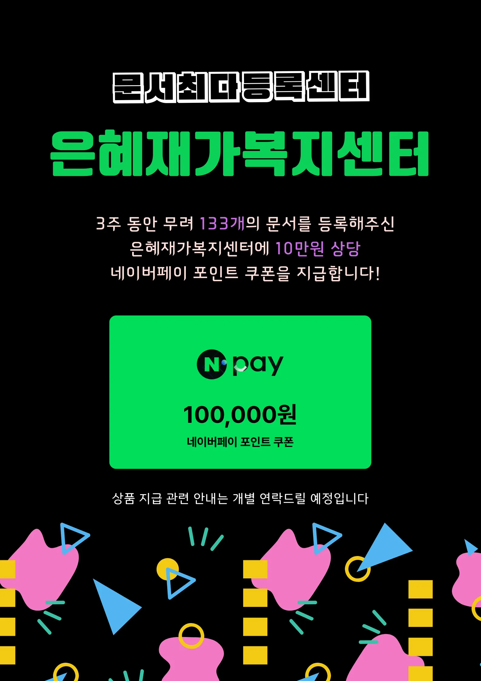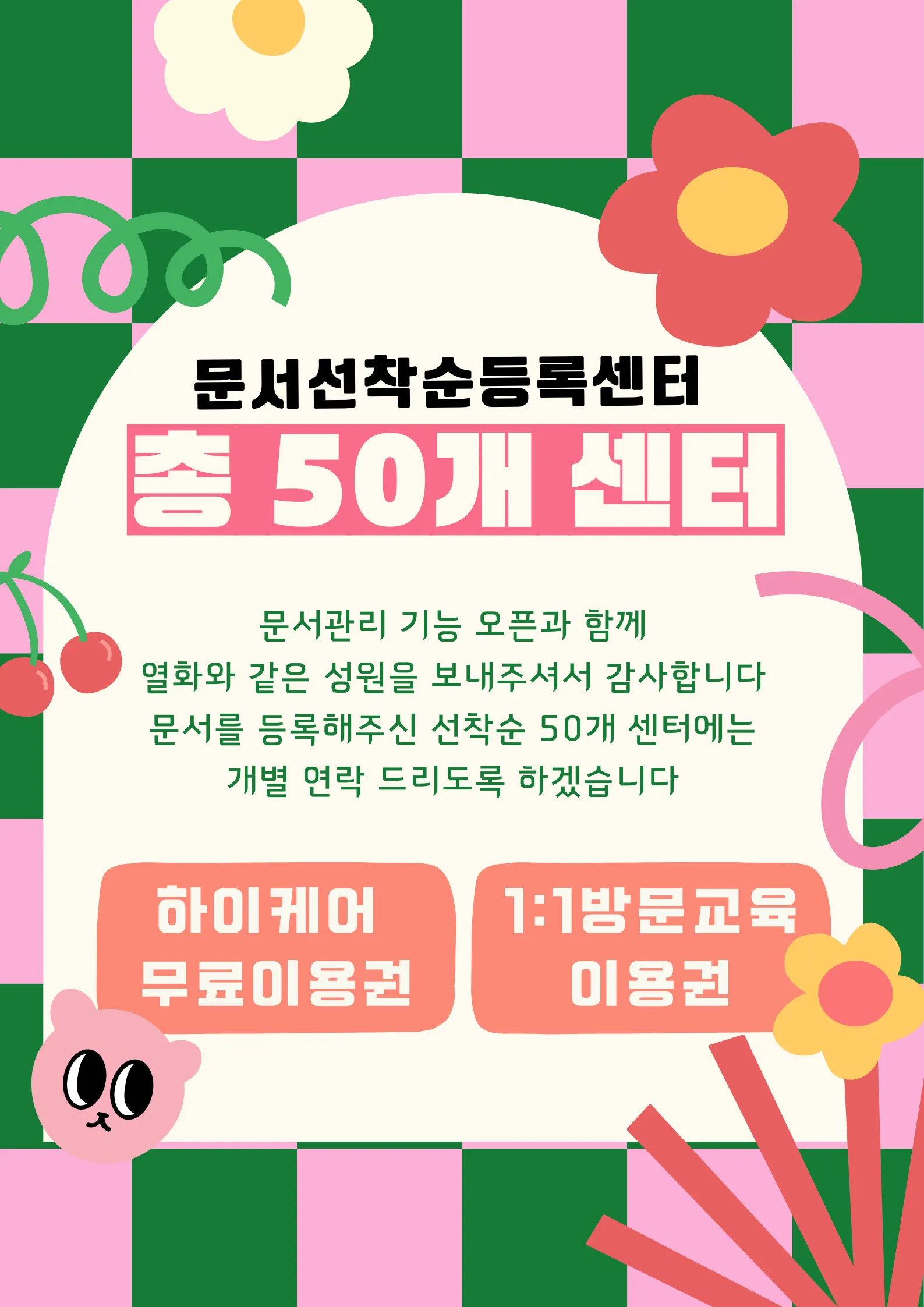 문서관리 기능을 누구보다 빠르게 이용해주신 센터 50개소, 가장 많은 문서를 등록해주신 센터 1개소에는 본사에서 직접 연락을 드릴 예정입니다.