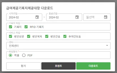 시작년월~종료년월 선택, 기록지타입 선택, 서비스 타입 선택, 파일형식 선택 후 다운로드