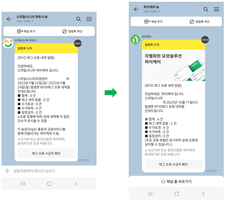 기존 하이케어에서 발송되던 알림톡은 모두 “스마일시니어 파트너”카카오톡 채널을 통해 발송되었는데요!