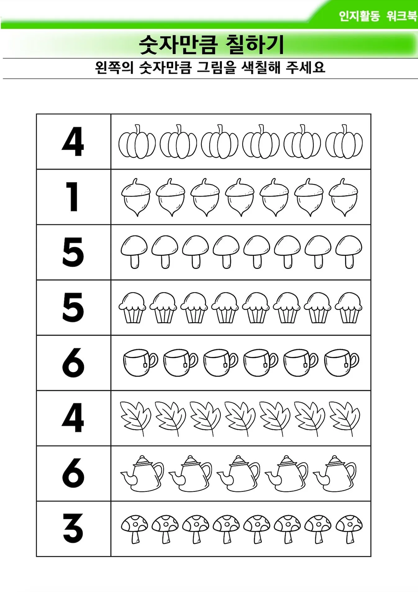 색칠할 갯수를 보고, 각 사물을 갯수만큼 예쁘게 색칠해보는 자료입니다.