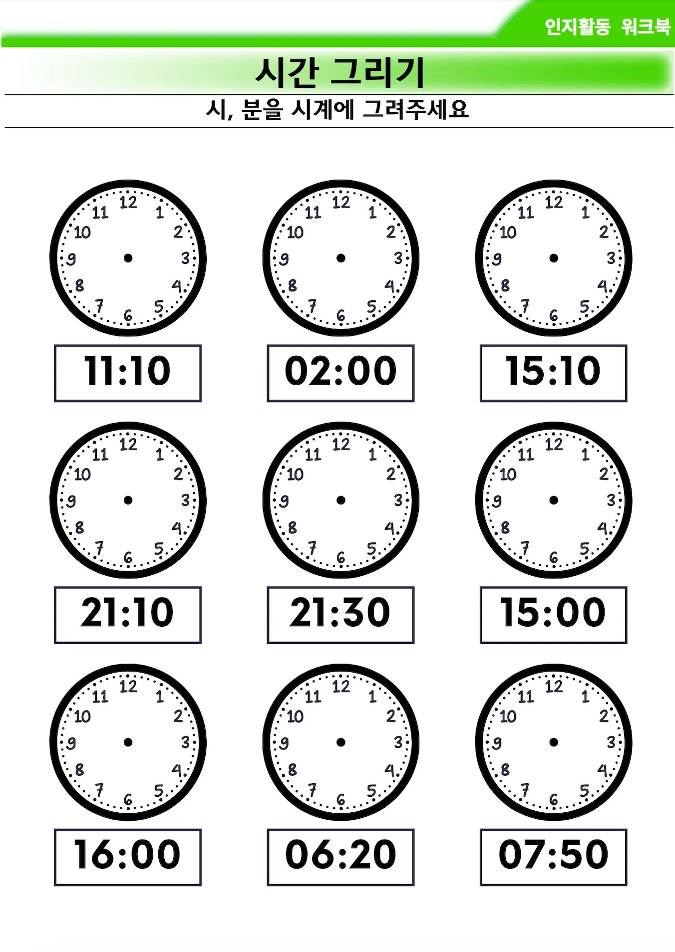 숫자로 주어진 시간을 보고, 직접 시계 위에 시침과 분침을 그려볼 수 있도록 자료를 제공합니다.
