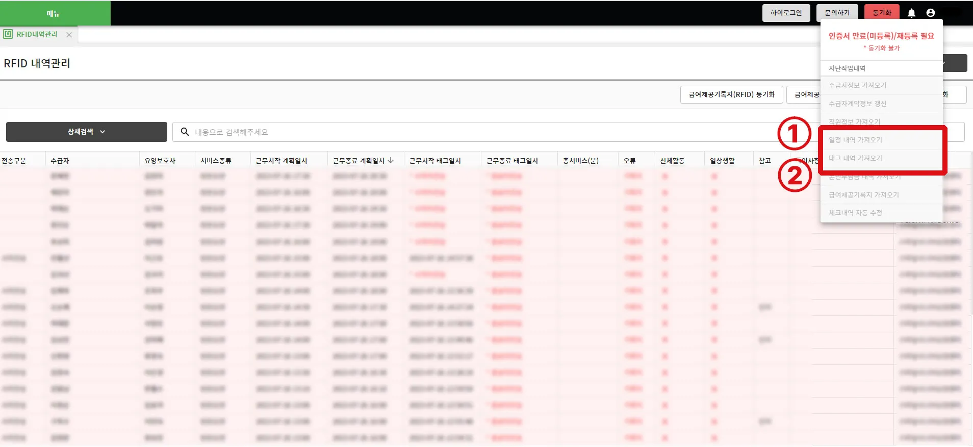 롱텀에서 일정 수정 후 다시 태그 내역 동기화를 하였는데도, RFID 내역 오류가 정상으로 바뀌지 않으셨다면 아래 방법대로 진행해 보세요.