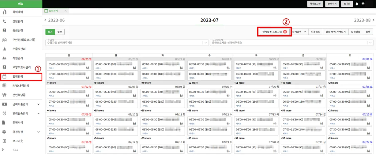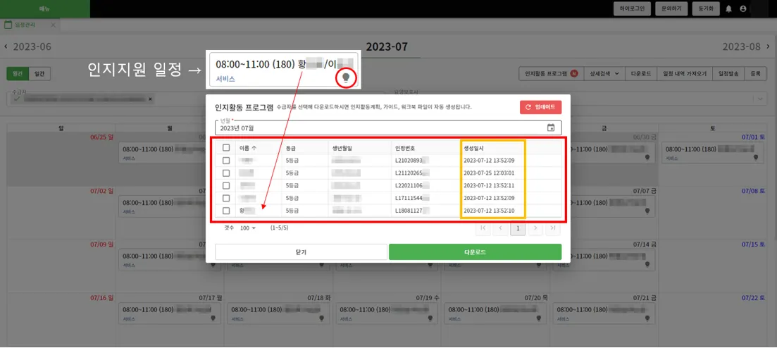 2. 월 별 일정이 등록되면 인지등급 수급자 별 자동 생성 되어 리스트에서 확인할 수 있어요!