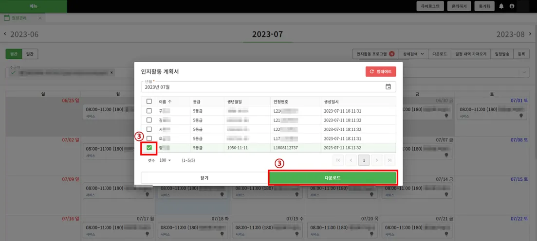 3. 인지활동 계획서를 다운로드하려는 수급자를 1명 이상 체크 후 다운로드 버튼을 눌러 이용해 보세요!