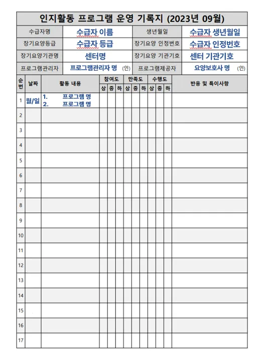 1. 인지활동 프로그램 워크북 내 운영기록지 양식 추가