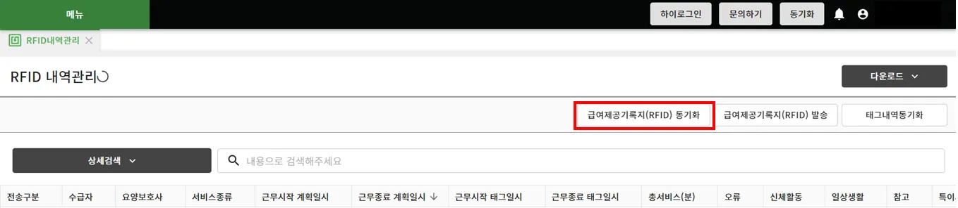 RFID내역관리 접속 > 급여제공기록지(RFID) 동기화 클릭 > 07월 동기화 진행 이후 발송 해주시기 바랍니다.