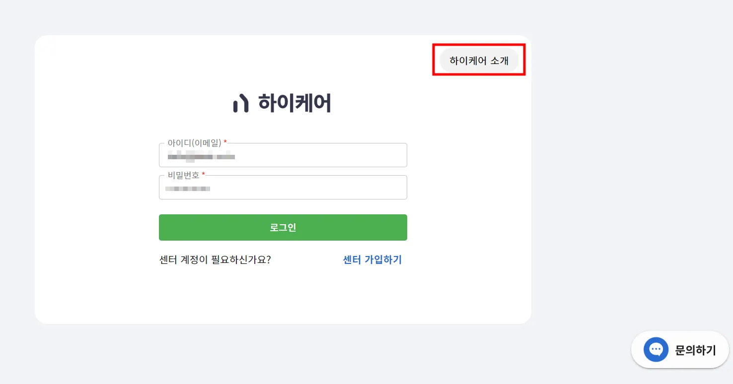 하이케어 로그인 화면에서 하이케어 소개 버튼을 누르면 하이케어의 안내 페이지로 이동합니다!