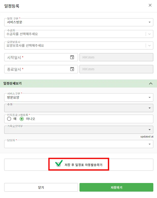 “저장 후 일정표 자동발송” 에 체크 후 저장 시 수정된 일정표가 수급자와 요양보호사에게