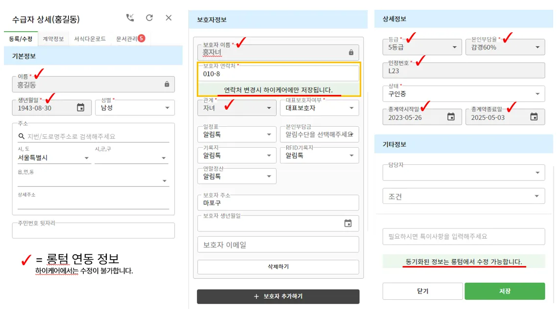 롱텀 연동 이후 하이케어에서 수정 불가한 항목은 비 활성화 처리 됩니다.