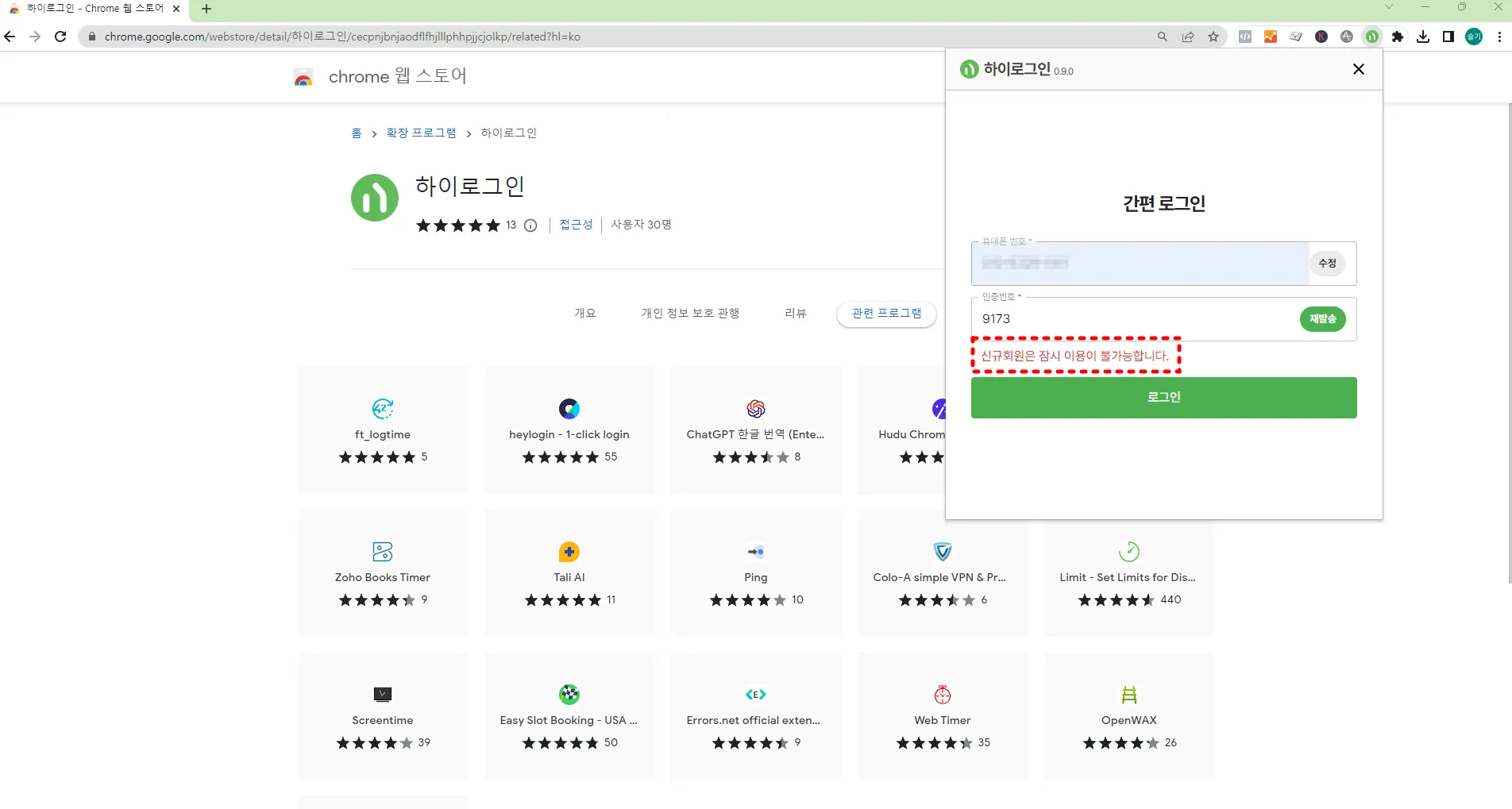 하이로그인 설치 후 우측 상단에 작은 초록색 하이케어 아이콘을 눌러 인증을 시도하신 경우에는 신규회원은 잠시 이용이 불가능합니다메세지를 보실 수 있습니다.