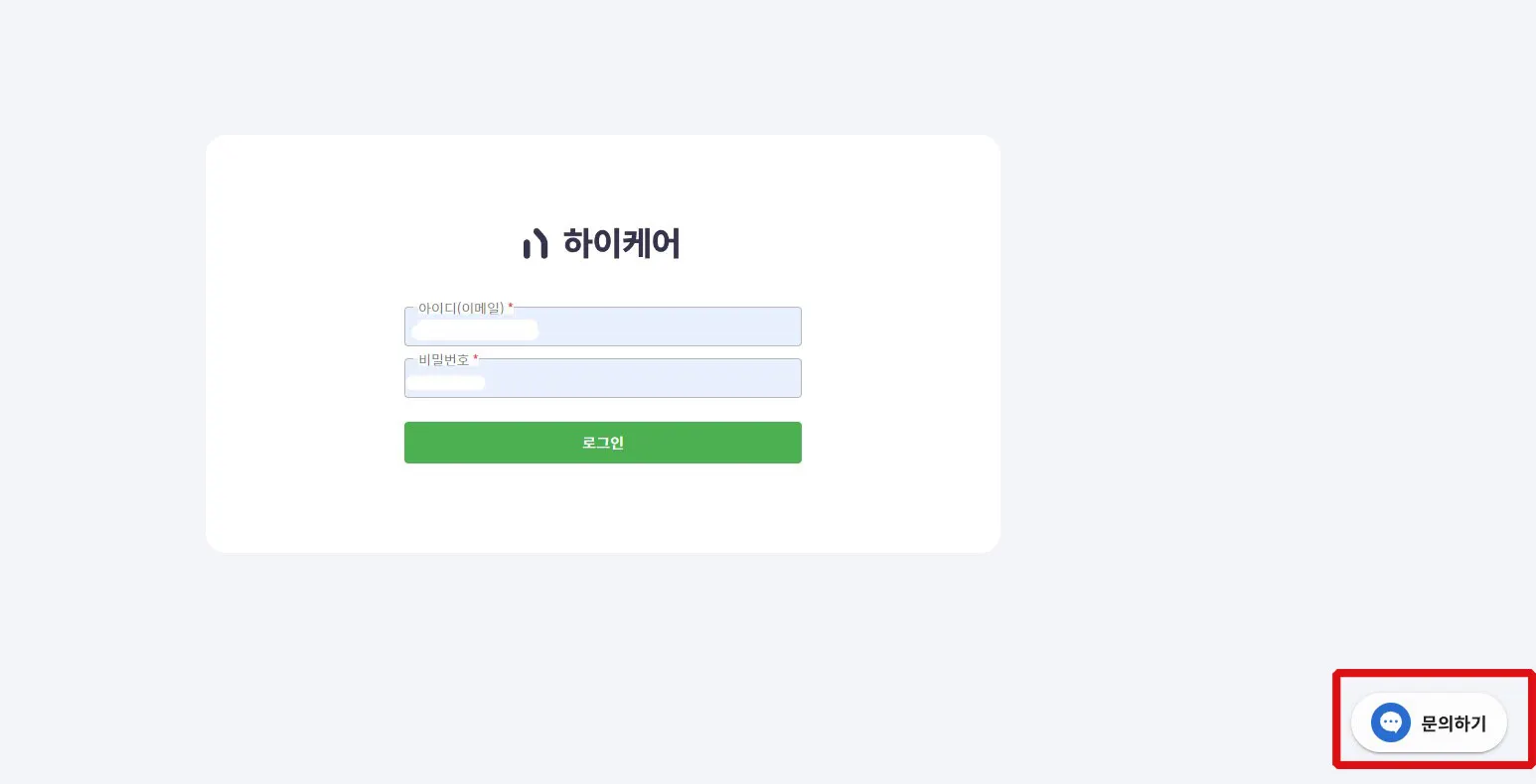② 하이케어의 아이디는 이메일 주소입니다. 주소를 정확히 입력하셨는지 확인해 주세요. ③ 1,2번에 맞게 로그인을 진행했지만 비밀번호가 다르다고 하는 경우, 오른쪽 하단 [문의하기] 버튼을 클릭하여 문의해주세요! 비밀번호 초기화는 하이케어팀이 도와드리고 있어요.