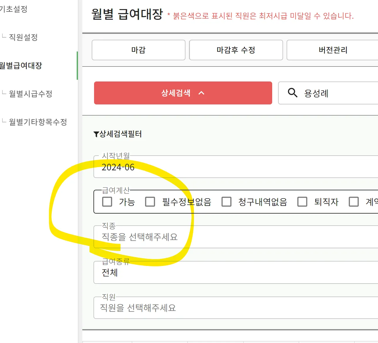 월별급여대장은 기본적으로 ‘계산이 가능한’ 근로자만 나오도록 ‘가능’이 체크되어 있어, 이 부분을 해제해주셔야 합니다.