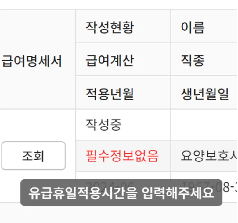 ② 해제 시 해당 직원분이 보인다면 다음과 같이 빨간 글자로 ‘필수정보없음’이라고 메시지가 나오실 것입니다. 이 경우 마우스를 올려보면 어떤 필수정보가 없는지 확인이 가능합니다.