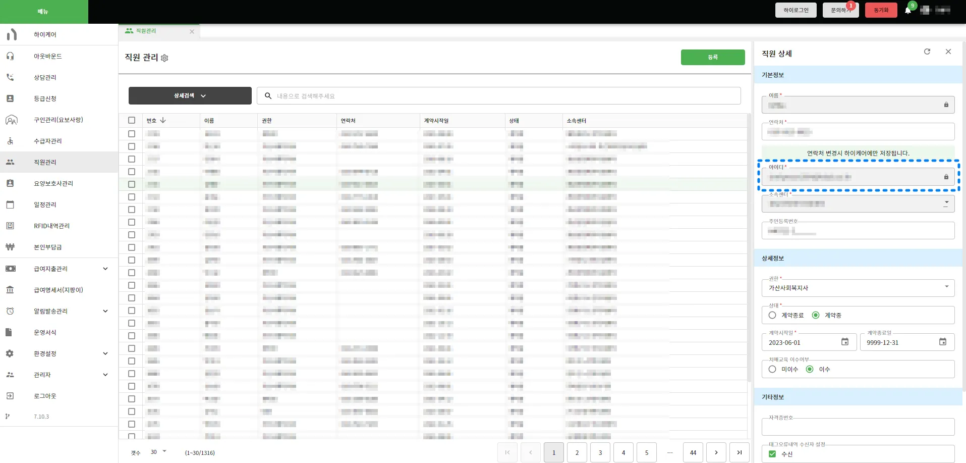 복지사님 계정에서는 본인이 담당하고 계신 수급자님의 정보가 우선적으로 보이며, 급여 지출 관리 메뉴, 센터 설정 메뉴, 직원 관리 메뉴 등에 권한이 제한되고 있어요.